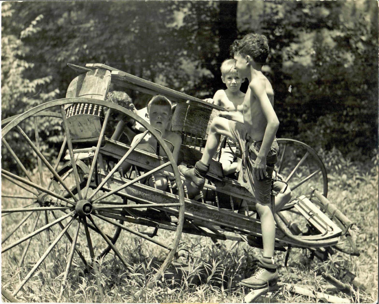 Students examine farm equipment at June Camp in the 1930s.